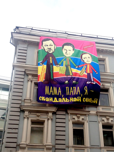 23 июня на площади перед Большим театром был размещен десятиметровый баннер, на котором изображены Генеральный директор Большого театра Владимир Урин, главный дирижер и музыкальный руководитель Туган Сохиев и режиссер Тимофей Кулябин. Герои держатся за руки, подпись к картинке: «Мама, папа, я — скандальная семья». Ответственность за эту акцию взяло на себя сообщество «Главплакат», протестующее таким образом против приглашения на постановку в Большой театр режиссера Тимофея Кулябина, известного, в частности, своим спектаклем «Тангейзер» в Новосибирской опере.