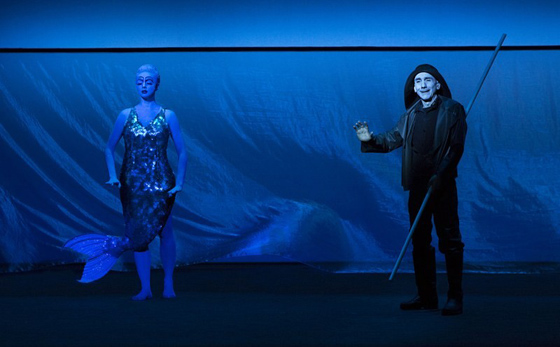 Уилсон действует на сцене легко, буквально и трепетно: разбитое корыто, остров Буян в образе нарядной игрушки, тюль-море, елочка из золотых орешков белочки, хвост в костюме сверкающей рыбки etc. А изощренность он вменяет актерам: их костюмы и парики ирокезов/панков (Юлия фон Лелива), грим (Мануэла Халлиган), пластика, голоса, интонации — забытый урок, преподанный русской актерской школе, комедиантству противопоказанной. Или бессознательно превратившей комедиантство в антрепризную пародию.