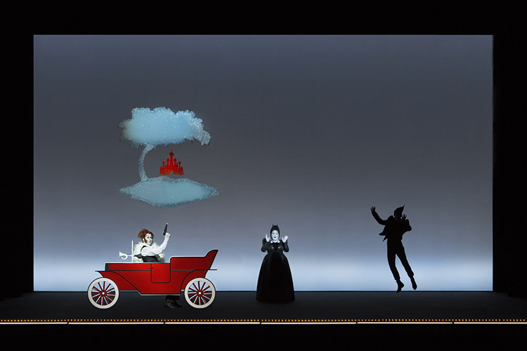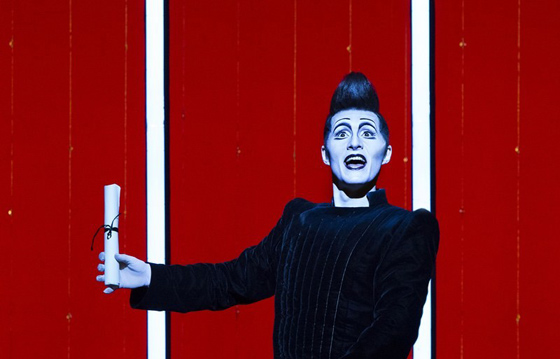 © Lucie Jansch В сущности, эти «Сказки» — оммаж театральности как таковой, а вовсе не «театр художника». Пережив эпоху новаторских открытий в 70-е, Уилсон — классический путь пионерских художников — обратился к силе первичных элементов театра, проработав с московскими актерами мощь «маски, жеста, движения и интриги» (Мейерхольд). И — каботинскую технику. Чудодейственную, а не декоративную. Такому режиссерскому ходу, одновременно зрелищному, всесословному и острому, диссонансному, поспособствовал гротеск. Разработал его Уилсон многосторонне. Разложил на краски, звуки и миниатюрные детали. Рыбак — Александр Строев, отработав проход и текст, высовывает почерненный язык; Балда — Александр Новин — в костюме с плакатов конструктивистов наблюдает со скалы за гульливой и беззащитной интермедией бесов; тридцать три богатыря выезжают из кулисы, уменьшаясь в размере до мизинца; крохотная лодочка Рыбака подвешена на большом экране моря-неба etc.