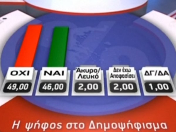 Чтобы референдум был признан состоявшимся, в голосовании должны были принять участие не менее 40% избирателей. По данным Министерства внутренних дел Греции, голосование прошло при высокой явке — свой выбор сделали почти 60% граждан. По предварительным данным на момент написания этого материала, более 61% избирателей не одобрили соглашение, а 39% - одобрили. Экзит-полы тоже показывают победу противников предложений «тройки».