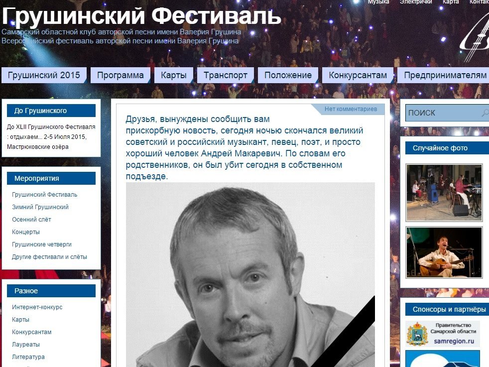 Отметим, Чернин опроверг ранее размещенное на официальном сайте «Грушинского фестиваля» сообщение о том, что Макаревич якобы был убит в собственном подъезде в ночь на 6 июля.