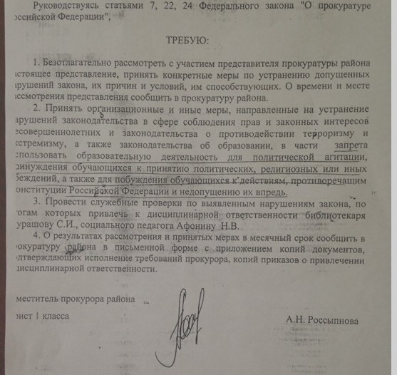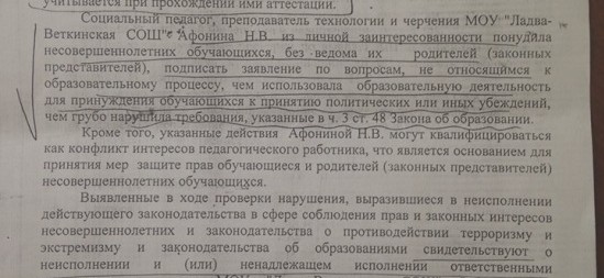 Это деяние педагога было расценено прокуратурой как "использование образовательной деятельности для принуждения обучающихся к принятию политических или иных убеждений". Ниже выдержки из пространного представления: