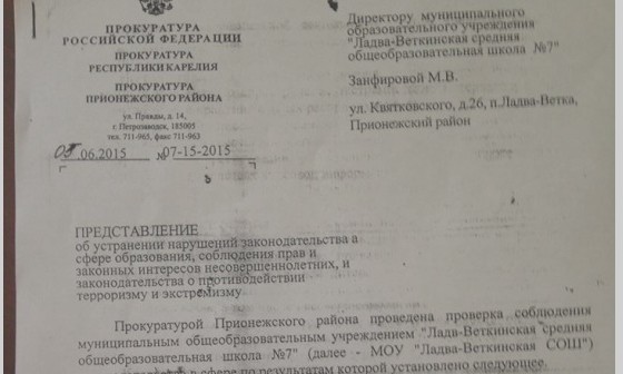 По требованию Прионежской прокуратуры республики Карелия учительница технологии и черчения ладва-веткинской средней школы Нина Васильевна Афонина получила дисциплинарное взыскание. Опуская условности юридического языка, можно сказать, за то, что привлекла старшеклассников к подписанию обращения на имя В.В.Путина по поводу неприемлемого состояния дорог вокруг поселка, разрушаемых главным местным хозяйствующим субъектом - леспромхозом. По правде сказать, прокурорское обоснование допущенных Афониной нарушений выглядит крайне сомнительно.