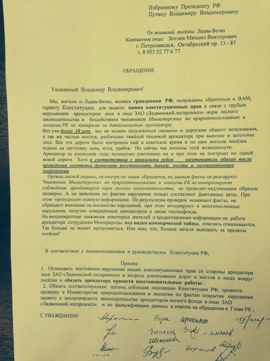 В том, что техника Ладвинского леспромхоза превращает посёлок в неприступную крепость, подписанты петиции вряд ли лукавят. Всё так. Вместо дорог - непролазные канавы и грязь. Ни пройти, ни проехать. Как явствует из текста, ранее было обращение доведённых до отчаяния жителей главе республики, но карельское министерство природопользования и экологии, по их мнению, при рассмотрении вопроса скрыло от него реальное положение дел. Проявив инициативу, Афонина зачитала новое письмо, уже главе государства, учащимся старших классов, после чего они также решили его подписать.