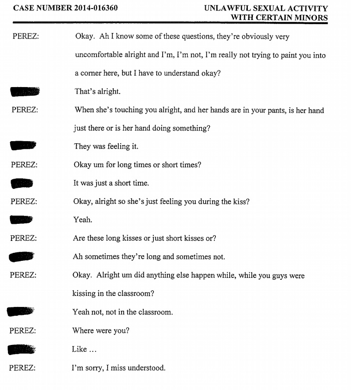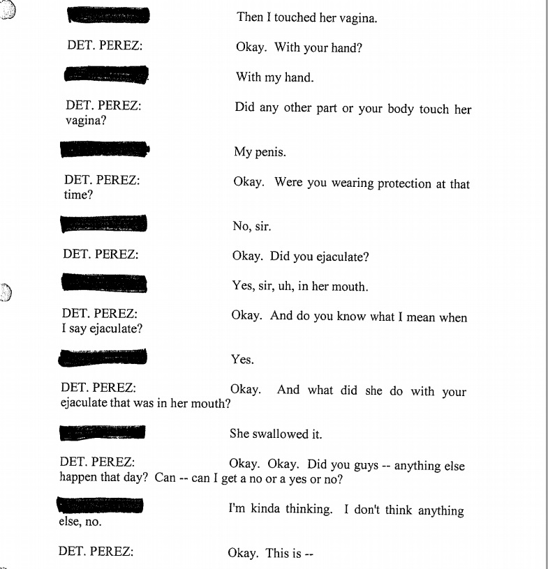 Подробнее мы узнаем уже из допроса потерпевшего полицией. Во время поцелуев учительница залезала рукой к нему в штаны и прикасалась к его члену. Сексом они занялись впервые на заднем сидении в машине Дженнифер (Тойота Такома) 20 января, причем секс (по словам Х) инициировала учительница. В деле содержится невероятно подробное описание секса, но The Insider не будет приводить все детали, чтобы читатель не потерял концентрацию.