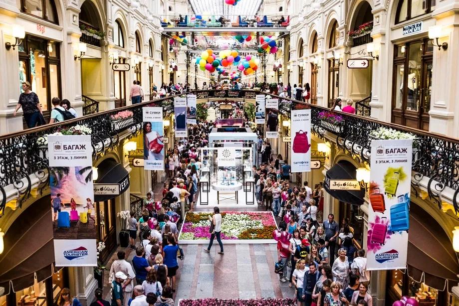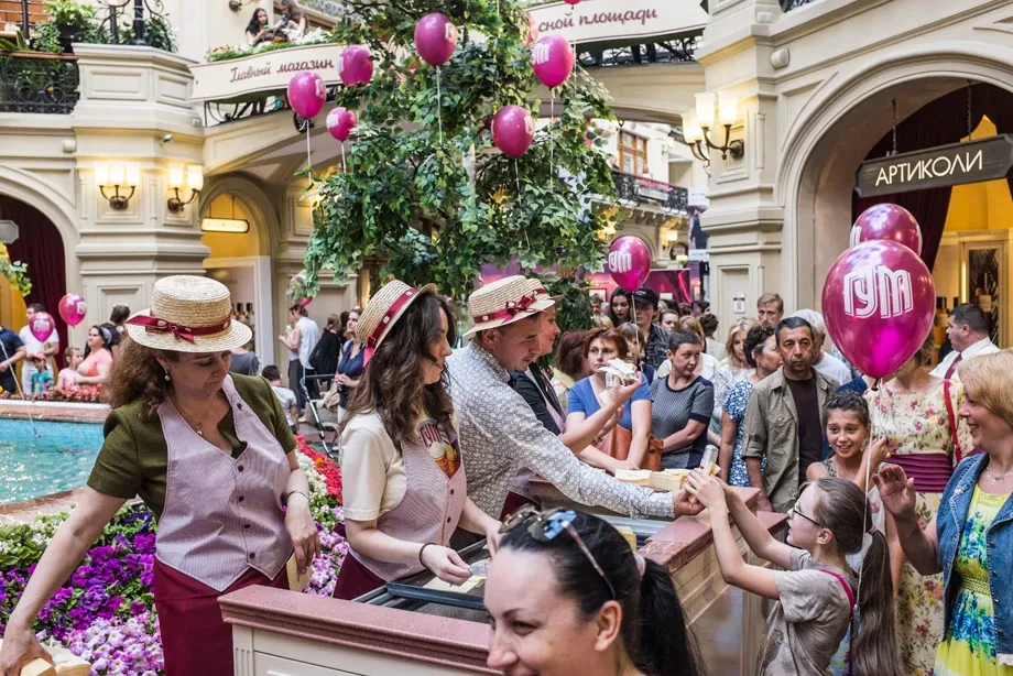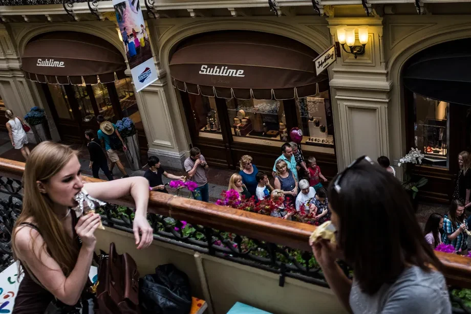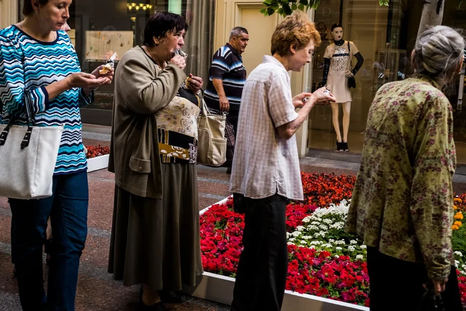 Сейчас ГУМ состоит из очередей. По коридорам приходится передвигаться бочком: очереди извиваются вокруг стендов Dior и клумб с цветами и заканчиваются у киосков «Мороженое»: сегодня его раздают бесплатно. Стоят по-летнему красивые девушки и беременные женщины, стоят старушки, бородатые хипстеры и семьи с маленькими детьми. Сохранившие советские навыки пенсионерки ориентируются моментально: занимают очередь в трех местах сразу, а в четвертом ставят дочь с внуком.