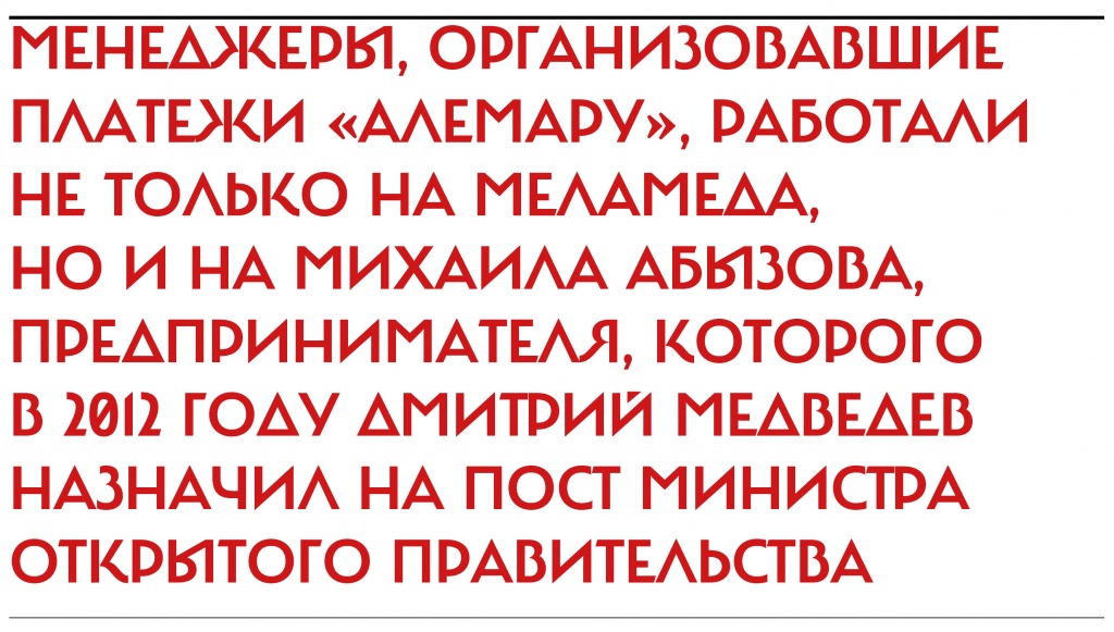 Но Чубайс — не единственный кандидат на роль жертвы дела о растрате. Менеджеры, организовавшие платежи «Алемару», работали не только на Меламеда, но и на Михаила Абызова, предпринимателя, которого в 2012 году Дмитрий Медведев назначил на пост министра Открытого правительства. Абызов — тоже член команды Чубайса, в РАО Меламед отвечал за финансовые потоки, а Абызов — за неплатежи. Как рассказывает бывший сотрудник энергетической монополии, Абызов ездил на «стрелки», вытряхивал деньги из крупных неплательщиков в регионах и боролся с теми, кто самовольно тянул в свои конторы и конторки электропровода. Сегодня Абызов — один из самых близких к премьеру Медведеву министров, их связывают дружеские отношения, Медведев доверяет Абызову.