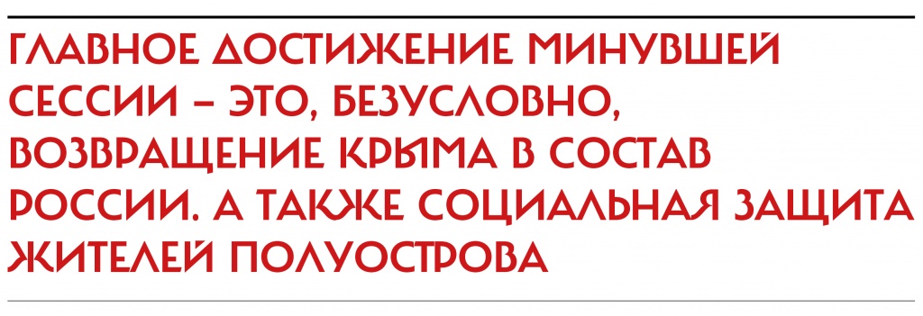 фракция ЕР, член Комитета по безопасности и противодействию коррупции: Главное достижение минувшей сессии — это, безусловно, возвращение Крыма в состав России. А также социальная защита жителей полуострова. У них до сих пор огромная масса проблем, и нами сделано все, чтобы облегчить их жизнь. Что касается негативной части, то многие депутаты, особенно в преддверии выборной кампании, вносят законопроекты, которые не имеют шанса на жизнь, — пошутили, посмеялись, получили пиар, а дальше? К сожалению, по таким законопроектам народ судит о способности Думы решать насущные вопросы.