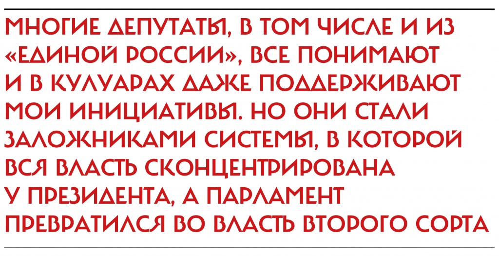 Вам часто коллеги-депутаты устраивают обструкцию? Знаете, со стороны все выглядит по-другому, чем изнутри. Многие депутаты, в том числе и из «Единой России», все понимают и в кулуарах даже поддерживают мои инициативы. Но они стали заложниками системы, в которой вся власть сконцентрирована у президента, а парламент превратился во власть второго сорта — в палату таких кнопкодавов. И они вынуждены играть по этим правилам. Они уже встроены в систему и не могут ничего изменить. Ко мне такое уважительное отношение, несмотря на то, что во время голосования они занимают позицию совершенно противоположную.