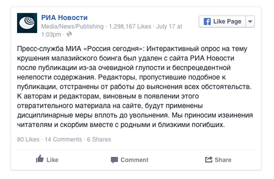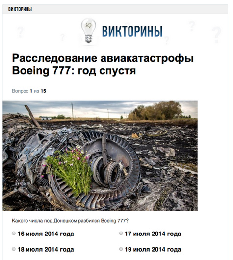 РИА Новости сделало викторину, предлагающую читателям 15 вопросов о пассажирском «Боинге», сбитом над Донбассом. Если читатель отвечал на вопрос правильно, например, указывал точное количество жертв, алгоритм поздравлял с правильным ответом.