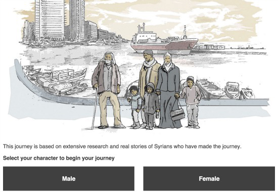 © РИА «Новости» ВВС (тоже государственное новостное агентство) в апреле 2015 года выпустила проект «Syrian Journey: Choose your own escape route». Это, по сути, интерактивная игра, предлагающая читателю побыть сирийским беженцем и выбрать от имени мужчины или женщины путь эвакуации из Сирии. На каждый выбор пользователя викторина рисует продвижение маршрута по карте и сообщает, какие опасности и лишения могут ожидать беженца в этой точке маршрута, включая разделение семей, захват в заложники, депортацию или смерть. Репортажная, по сути, информация разворачивается в игровой форме: новая порция контента зависит от выбора читателя. Это еще одна разновидность «сервиса ленивого авторства», когда читатель вовлекается на уровне «мышковой» активности, а значит, взаимодействует с контентом и брендом медиа более активно, чем если бы просто пассивно воспринимал информацию.