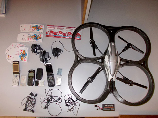 Все эти предметы были изъяты у подозреваемого, который был "задержан на режимной территории при попытке запустить в учреждение радиоуправляемый квадрокоптер".