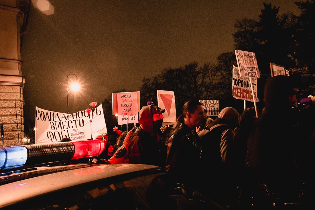 Punks at a demonstration on January 19, 2015, in St. Petersburg in memory of slain lawyer Stanislav Markelov and Anastasia Baburova, a journalist and activist in Russia's anarchist-environmentalist movement, who were murdered on January 19, 2009, in downtown Moscow. Two radical nationalists, Nikita Tikhonov and Yevgenia Khasis, were later convicted of the crime. Tikhonov was sentenced to life in prison, and Khasis got 18 years behind bars.