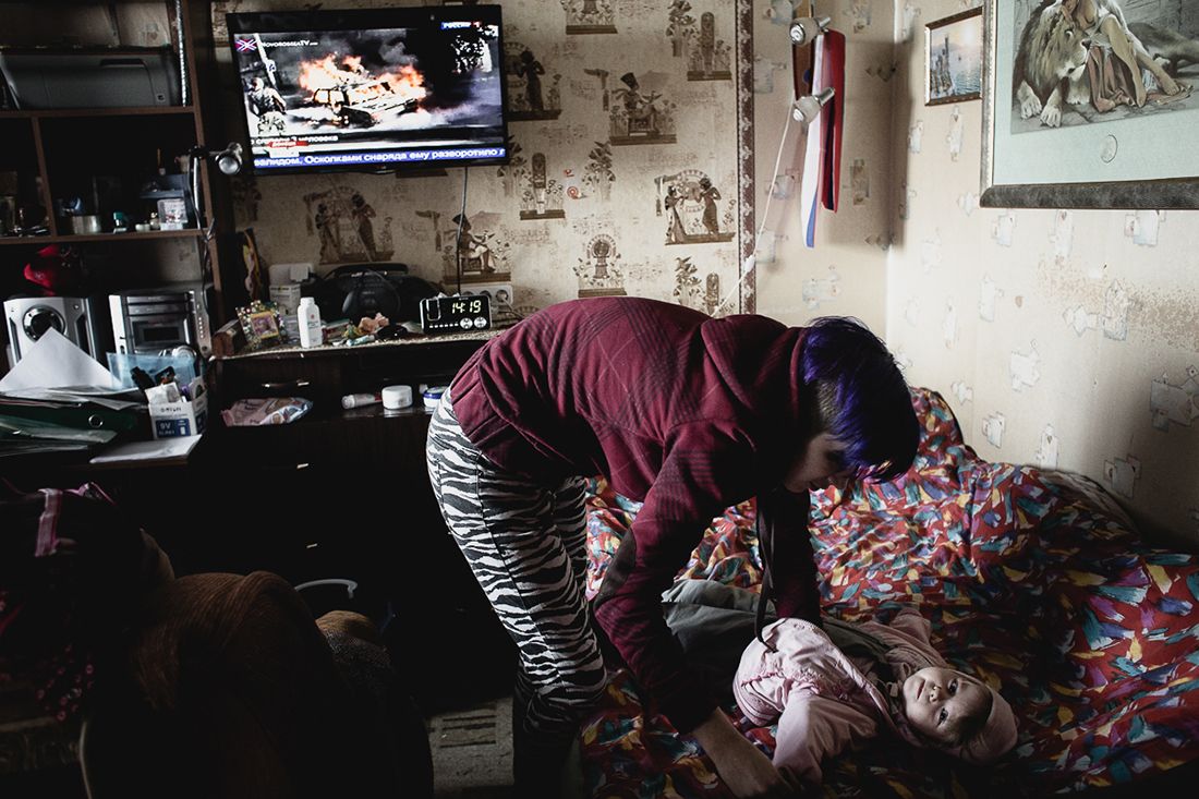 Dana (24 years old) dresses her daughter, Marina, to go out for a walk. The child's father is a drummer in a punk band. He doesn't live with them or visit his daughter.