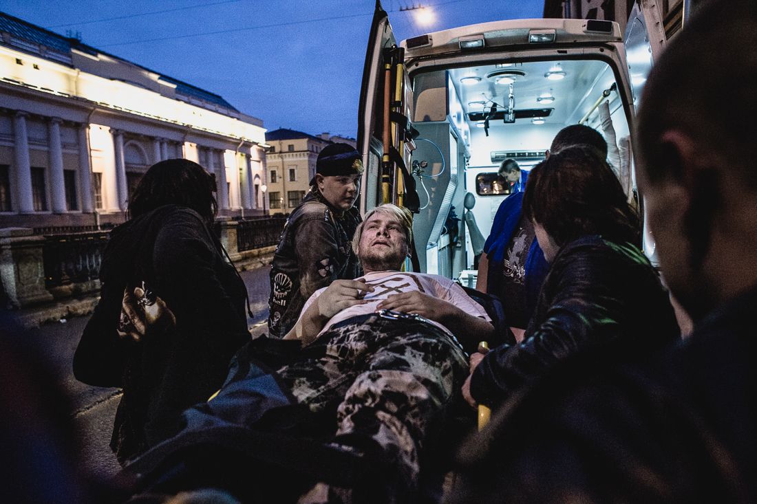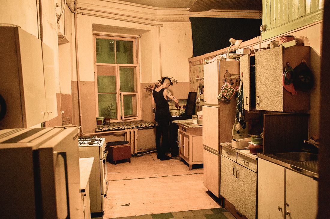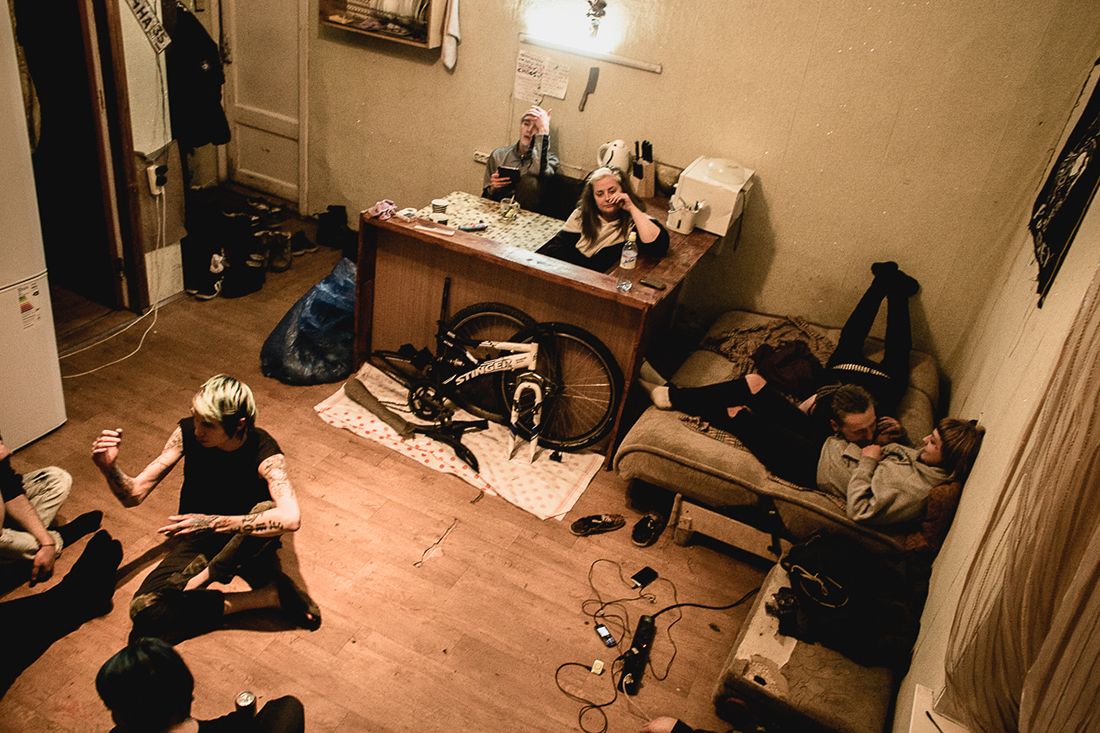 After a concert, a group hangs out in somebody's rented room in a communal apartment complex. Many punks from out of town rent rooms in communal apartments, built in St. Petersburg during the Soviet era. It's some of the cheapest housing available in the city today.