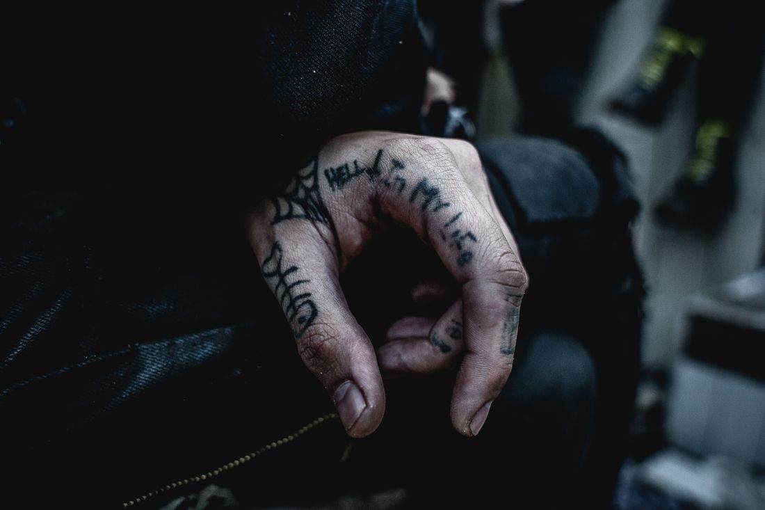 Self-made tattoos. The hand and the tattoos belong to a man who calls himself "Mouse."
