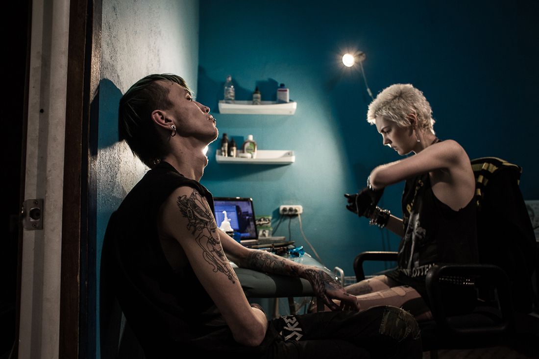 Sasha "Tsoi" (after the beloved Soviet rock pioneer Viktor Tsoi) is adding to his forearm a tattoo copied from a photograph of American punk artist John John Jesse. Tsoi calls the design "Sins of a Generation."
