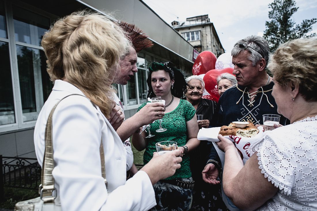 The parents of the bride and groom greet their children outside the city hall registration office after the marriage is made official, sharing a traditional celebratory bread. Sasha was seeing his father (on the right in the photo above) for the first time in five years. "I don't know how it turned out that way... we don't even live that far from him," Sasha says. "He's had another family for a long time now, and he generally has more right-wing views."