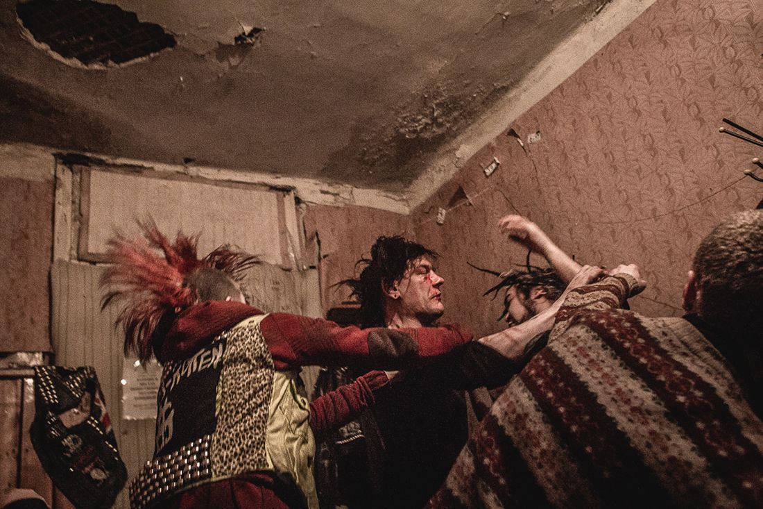 A friendly brawl between two punks in an illegally occupied building. A tenant in an average "squat" in Russia sticks around for several months. Usually the police come through and evict everyone, so punks try to keep the locations of these lodgings a secret. Most squats exist only in the summer, as they're not fit to sustain residents through the Russian winter. The organizer of this squat is proud that his group has managed to stay put for 11 months now, having wired the building for electricity and survived a winter that included temperatures 20 degrees below zero (negative 4 degrees Fahrenheit). Throughout this time, the building sustained two fires, one of which killed a member of the group.