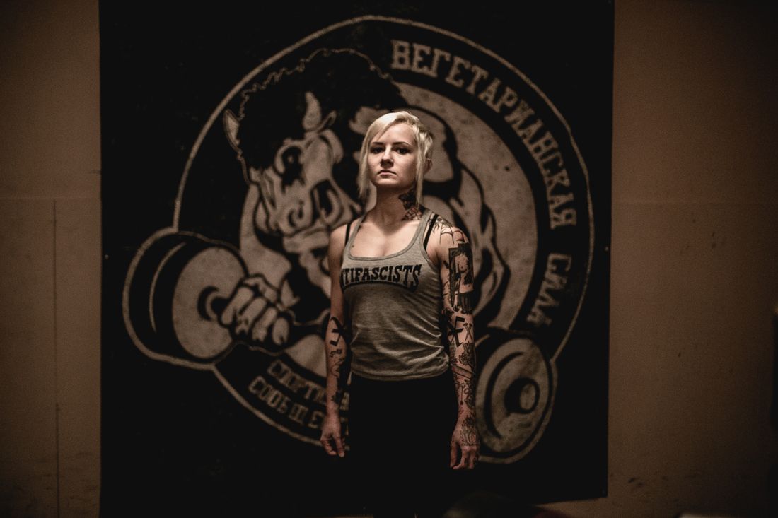 Oksana (25 years old) at the gym "Vegetarian Force." A vegan, Oksana does powerlifting and lives by the principles of "straight edge," as evidenced by the cross tattoo on the inside of her elbow. Like most punks in Russia, she supports the so-called anti-fascist movement, which actively fights back against neonazi groups.