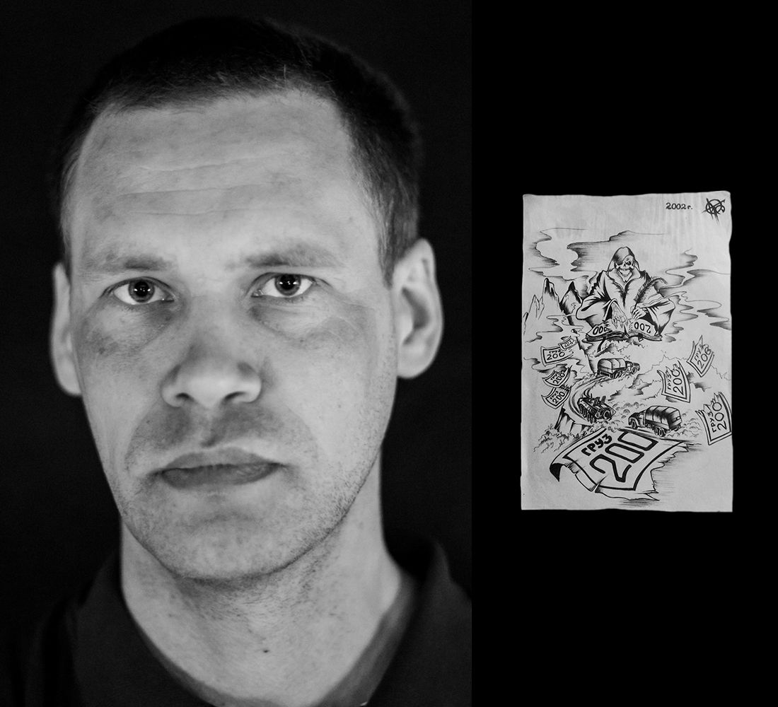 This is one of the sketches I made when I was serving in the army; it depicts Death handing out leaflets bearing the words “Cargo 200” [the Soviet and Russian code word referring to casualties being transported back home]. I drew it while at the lookout post.