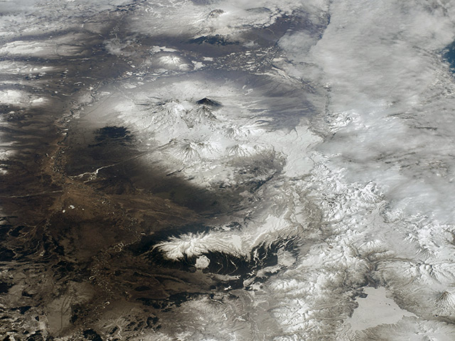 В центре фотографии видны три расположенных поблизости друг от друга действующих камчатских вулкана: Ключевский, Безымянный и Ушковский. Фото было сделано астронавтом с Международной космической станции (МКС), отмечается на сайте NASA.