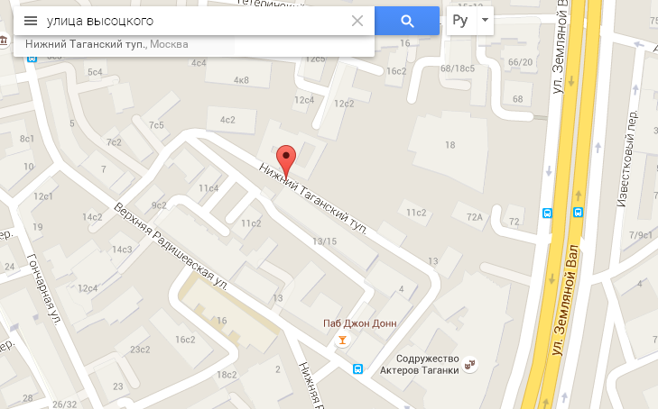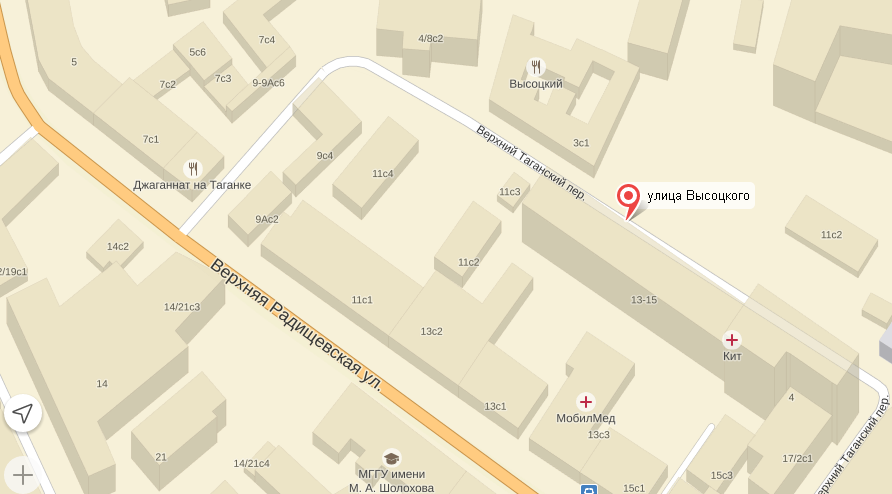 Сервис Яндекс.Карты уже начертил в Москве улицу Высоцкого. Это можно увидеть, если вбить в поисковую строку «Верхний Таганский переулок». Тогда поисковик установит точку на этой улице, назвав ее улицей Высоцкого. Google.Maps тоже уже умеет находить улицу Высоцкого, однако видит ее как «Нижний Таганский тупик». Скоро путаница будет устранена.