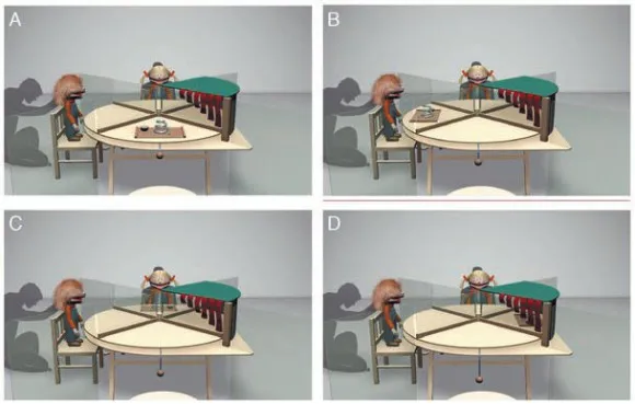 В исследованиях приняло участие несколько десятков немецких мальчиков и девочек. Ребенка усаживали за стол, разделенный на четыре сектора. Слева от него сидела марионетка, изображающая жертву несправедливости, напротив — марионетка-вор. Справа от ребенка находился закрытый сектор, «пещера»: что в нее попало, назад не возвращается. Вор и ребенок могли поворачивать стол по часовой стрелке, потянув за веревку. В начале эксперимента либо перед ребенком, либо перед жертвой клали печенье или игрушку (рис. 1А, В). Затем вор тянул за веревку и поворачивал стол, перемещая игрушку к себе (рис. 1С). Кукла-жертва ничего поделать не в состоянии, и ребенок это понимал, но он сам мог вмешаться, потянув за свой конец веревки и повернув стол так, что объект безвозвратно скрывался в пещере (рис. 1D). Дальше стол не вращается. Теперь игрушка не доставалась никому, но вор был наказан и не мог ничего отнять во второй и третий разы (рис. 2А).