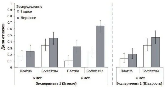 Американским участникам эксперимента рассказывали историю о том, как некий анонимный ребенок делил шесть конфет на двоих: либо он распределял их поровну, либо брал все конфеты себе. Участники видели только условные портреты детей и результаты дележки, которые можно было либо принять, либо отвергнуть, перемещая рычаг в «зеленую» или «красную» сторону. В последнем случае никто из нарисованных детей конфет не получает. Результаты опыта представлены на рис. 4 (эксперимент 1). Пятилетние дети отвергают справедливое и несправедливое распределение с равной частотой, шестилетки уже видят разницу.
