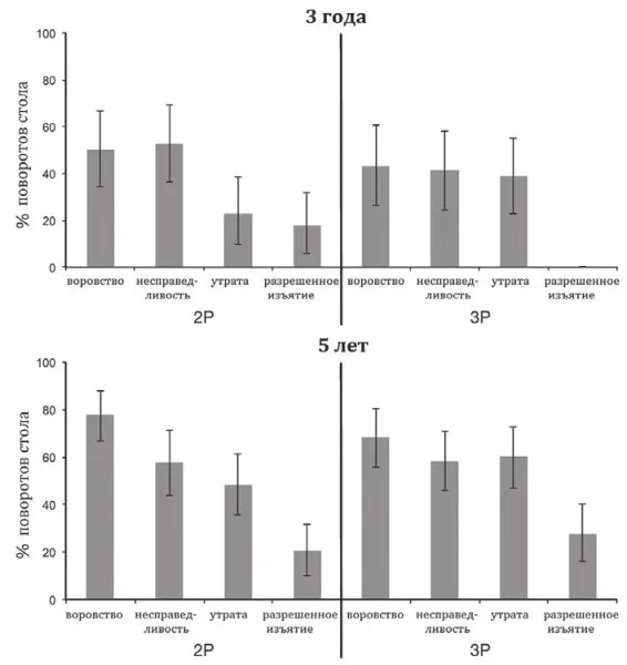 Результаты экспериментов представлены на рис. 3. И в этих ситуациях дети реагируют на чужую обиду как на свою. Интересно, что трех- и пятилетние малыши не видят большой разницы между тремя вариантами отъема игрушки или лакомства и протестуют против них примерно с равной частотой. Иными словами, оценивая каждый эпизод, дети обращают внимание на его последствия для жертвы, которую несправедливо лишили ценной вещи, а не на то, какая именно кукла эта сделала и кому в итоге достался подарок. Исключение составляет лишь случай, когда марионетка, прежде чем взять игрушку, спрашивала разрешения. Дети понимали, что попросить — это не то, что украсть или получить чужое, и, когда кукла или они сами отдавали игрушку, реже отправляли объект в пещеру. Трехлетние дети еще не имеют понятия о законности. Объясняя условия эксперимента, никто из взрослых не употреблял слово «наказание», и куклы, у которых отнимали игрушки, не протестовали. Но у малышей, оказывается, чувство справедливости развито очень сильно. Психологи провели с ними второй эксперимент, в котором трехлетки имели возможность вращать стол в обе стороны и не только отнимать предметы у вора, но и возвращать их владельцу. В такой ситуации они практически перестали пользоваться пещерой. Примерно в 80% случаев дети возвращали себе несправедливо изъятый предмет (в остальных эпизодах они просто не тянули за веревку). Если игрушку у них забирали, предварительно попросив, то дети пользовались возможностью получить ее назад в 40% случаев.