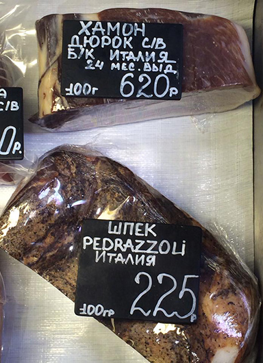 Хамон в «Цветном» Санкционные товары можно купить и вне сети. Достаточно зайти в любой московский супермаркет класса люкс или на большой рынок вроде Дорогомиловского. На пятом этаже универмага «Цветной» совершенно спокойно продается хамон, завезенный, по словам продавца, после санкций. Также в этом магазине можно приобрести, к примеру, венгерское фуа-гра. В супермаркете «Азбука вкуса» (по адресу Неглинная, 2) в продаже есть замороженные утиные грудки из Франции, итальянские замороженные цукини, большой выбор фуа-гра, в том числе цельного замороженного. Цельный ненарезанный хамон можно купить и в «Глобусе Гурмэ», расположенном в ГУМе.