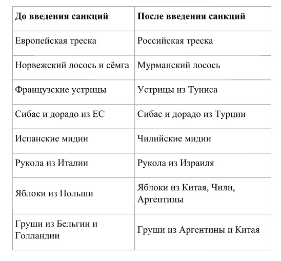Реэкспорт производится и через такие страны, как Швейцария. По словам члена Общественной палаты Павла Сычева, через некоторое время после введения санкций Швейцария увеличила поставки яблок в пять-шесть раз. «У них земли не хватит столько выращивать», — заключает Сычев. То же самое и с Белоруссией — не закупая ни нового оборудования, ни необходимого количества сырья, страна увеличила предложение молочной продукции.