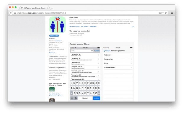 Приложение предоставляет пользователю список туалетов около каждой станции метро. Для работы приложения и поиска туалета не нужен Интернет.