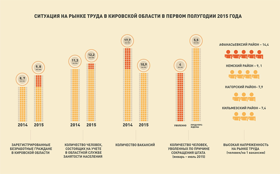 Также увеличилось и количество тех, кто трудится в режиме неполной занятости — 3,5 тысячи человек, в июле 2014 года их было меньше в четыре раза. За полгода 2015 года в Кировской области об увольнении предупредили уже 5,5 тысяч человек, и это в полтора раза выше, чем в прошлом году.
