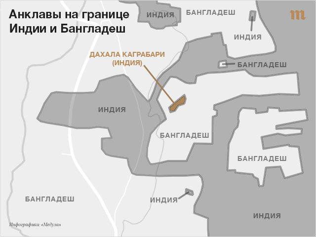 1 августа вступило в силу соглашение между Индией и Бангладеш об обмене анклавами — небольшими территориями одного государства, со всех сторон окруженными границами другого. Под действие закона попадают 162 таких территории — уже из этого можно сделать вывод о том, насколько запутанной была все это время граница между Индией и Бангладеш. Однако один случай является уникальным: индийский округ Дахала Каграбари, единственный в мире анклав третьего порядка. О нем коротко рассказывает журналист The Washington Post Адам Тэйлор.