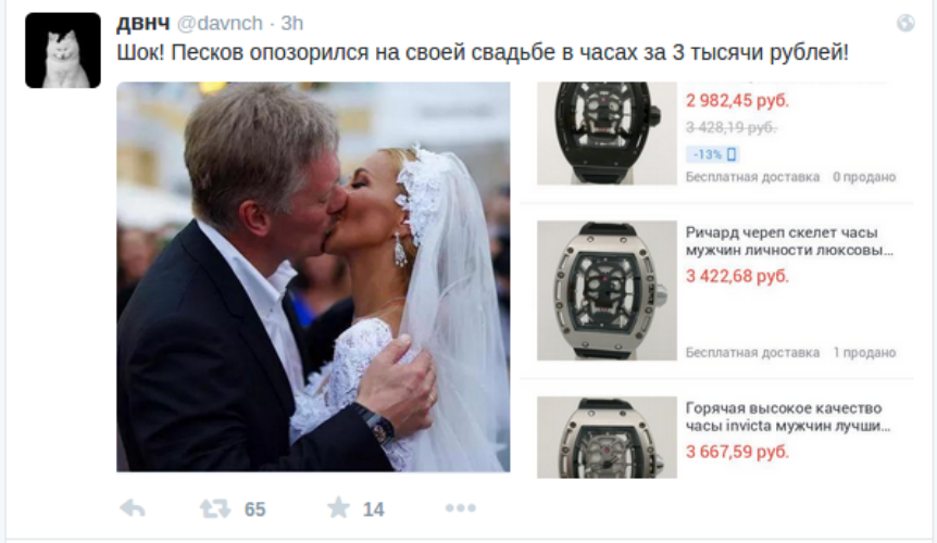 Пресс-секретарь президента Владимира Путина Дмитрий Песков и спортсменка Татьяна Навка поженились 1 августа. Снимок целующихся Пескова и Навки, на котором запястье жениха украшали часы, стал поводом для широкого обсуждения. Нападки в адрес Пескова и аргументы в его защиту, фотожабы с дорогими часами и Обамой, а также мнения самого пресс-секретаря и его жены — «Бумага» собрала в одном материале все, что о часах Пескова писали в интернете. Дмитрий Песков и Татьяна Навка. Фото: Олег Митволь. Первое «расследование», посвященное часам, опубликовал Алексей Навальный. По его словам, Песков был в Richard Mille RM 052 Tourbillon Skull — часах, выпущенных тиражом 30 штук. Блогер также уточнил их стоимость — от 600 тысяч евро до 1,4 миллиона долларов. По словам Навального, сам себе чиновник, годовой доход которого составляет 9,18 миллиона рублей, приобрести часы не мог, принять их в дар тоже. Блогер призвал администрацию президента РФ предоставить Фонду борьбы с коррупцией «официальные пояснения относительно источников средств, которые использованы для приобретения этих часов». Тезис Навального о том, что все подарки чиновников, стоимость которых превышает 3000 рублей, должны быть задекларированы, получил опровержение: согласно действующему законодательству, чиновники могут оставлять себе подарки, если они сделаны во время официальных мероприятий, к которым относится свадьба. «ЮРИСТ» Навальный вместе с «ЮРИСТАМИ» ФБК снова показали свой уровень (соснули) в истории с часами Пескова pic.twitter.com/Ywo8pd0ctC