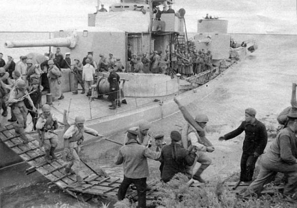 Монитор Амурской флотилии высаживает десант на реке Сунгари.