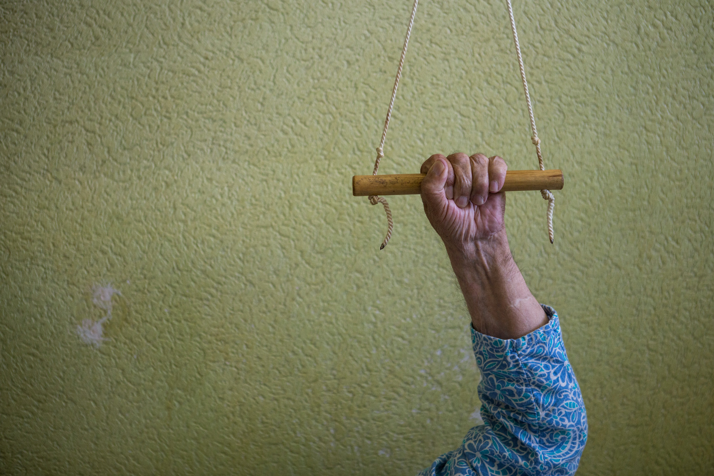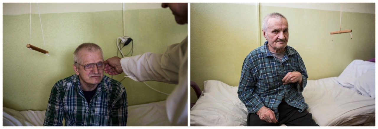 На втором этаже живут более подвижные старики. Владимиру Ивановичу Матвееву 83 года, но глаза у него гораздо веселее, чем у Александра и Ивана. У него проблемы с памятью — например, фамилию президента он не вспомнит. С первого этажа Владимира Ивановича перевели из-за прогресса: он научился писать левой рукой и стал гораздо лучше говорить. Но что именно он говорит, я практически не понимаю — мне «переводит» Андрей Миронович. Заниматься на тренажерах Владимир Иванович готов — а то даже до балкона в своей палате не дойти: «Хочу, палки тут чтобы были вокруг кровати, я бы хватался и по палате ходил», — медленно и старательно выговаривает он.