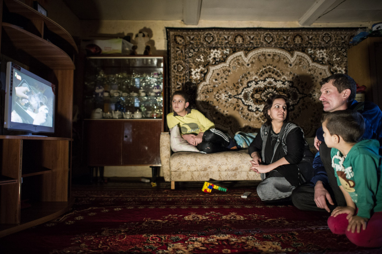 Семья Степановых. Юрий Степанов с женой Гулалай и сыновьями. Вечером вся семья смотрит телевизор — афганские спутниковые каналы.Фото: Алексей Николаев