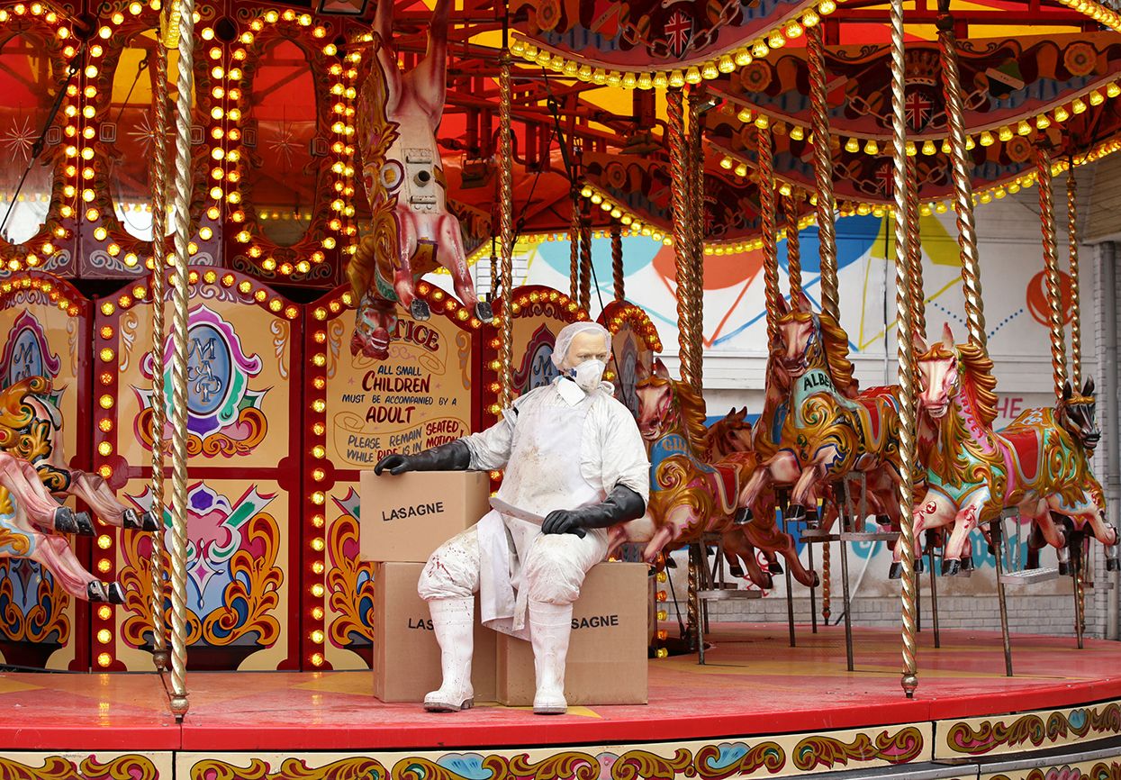 Британский уличный художник Бэнкси, который много лет успешно скрывает свою внешность и настоящее имя, открыл собственный парк развлечений неподалеку от Бристоля. Бэнкси называет свое творение «парком потрясений» и «Жутьлендом»; в действительности это крупнейшая выставка мастера стрит-арта за последние шесть лет. Помимо Бэнкси экспонаты для «парка потрясений» представили Дэмиен Херст, Дженни Холзер и другие современные художники. Выставка продлится всего пять недель, ее готовили втайне и представили журналистам только 20 августа. В субботу, 22 августа, «Жутьленд» откроется для всех желающих. «Медуза» выбрала наиболее интересные экспонаты крупнейшей выставки анонимного художника.