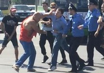 Тот не подчинился. Активисты стали нападать на противника с кулаками, а также попытались снять с него футболку и порвали ее. Мужчина попробовал скрыться, однако около 10 активистов настигли его и снова начали бить. Подоспевшие милиционеры задержали мужчину в футболке и доставили в Дзержинский райотдел милиции.