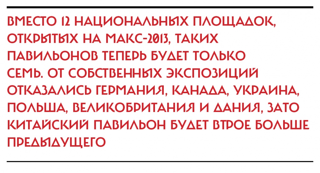 Вместо 12 национальных площадок, открытых на МАКС-2013, таких павильонов теперь будет только семь. От собственных экспозиций отказались Германия, Канада, Украина, Польша, Великобритания и Дания, зато китайский павильон будет втрое больше предыдущего. Отказ от национального формата не исключает участия отдельных компаний в частном порядке, но украинских предприятий, по понятным причинам, не будет в принципе.