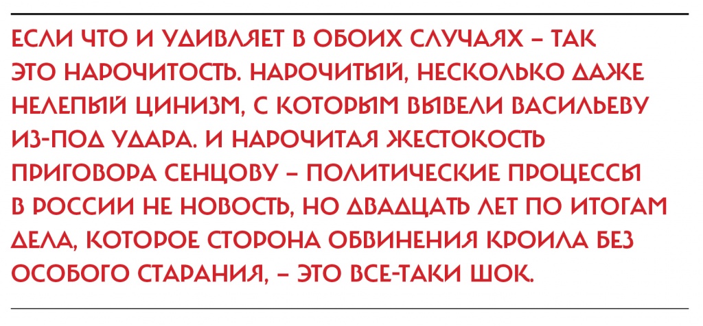Если что и удивляет в обоих случаях — так это нарочитость. Нарочитый, несколько даже нелепый цинизм, с которым вывели Васильеву из-под удара. И нарочитая жестокость приговора Сенцову — политические процессы в России не новость, но двадцать лет по итогам дела, которое сторона обвинения кроила без особого старания, — это все-таки шок.