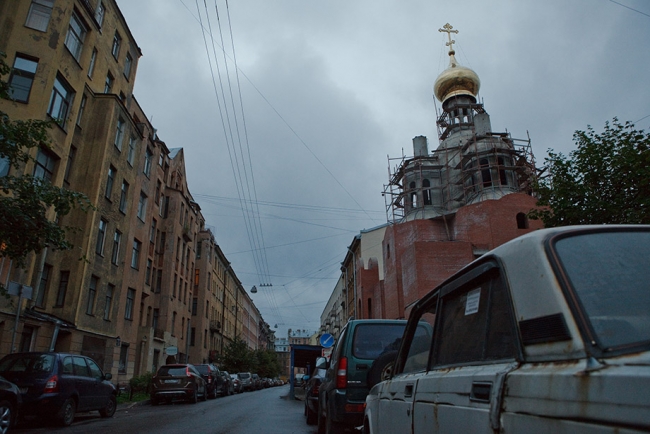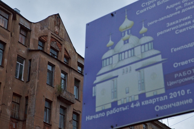 Следует напомнить, что аккурат напротив дома с Мефистофелем уже который год строится церковь в честь Ксения Блаженной. Жители окрестных домов протестовали: их лишили пожарного проезда и детской площадки.