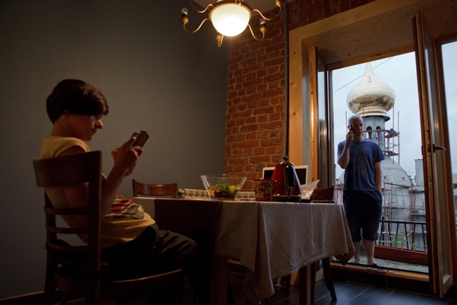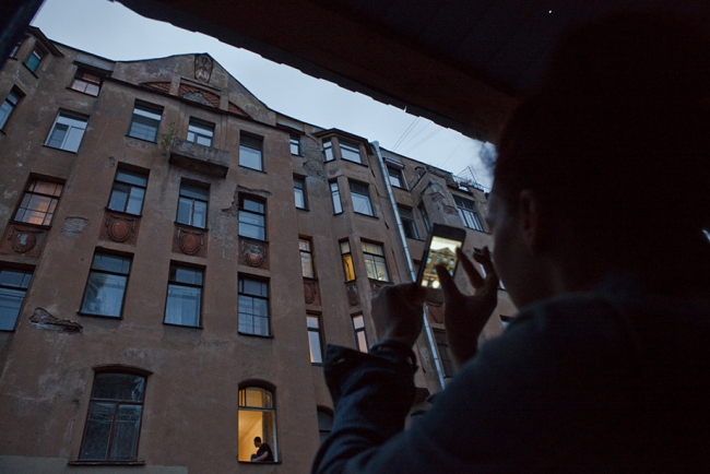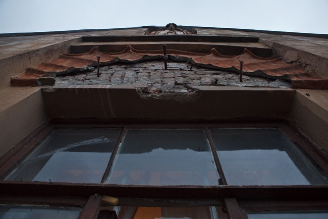 Поднимаемся в квартиру, над которой до сегодняшнего дня был барельеф. Хозяин квартиры Кирилл Алексеев рассказывает: «Рабочие пришли в десятом часу утра, не представились, отказались сказать, кто их послал, но попросили отодвинуть машины, чтобы обстучать фасад здания, проверить, как держится штукатурка». Кирилл уехал, а когда вернулся домой после обеда, уже все было кончено.