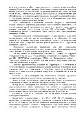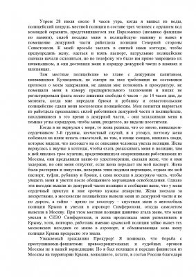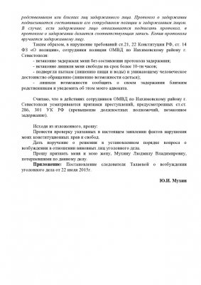 Согласно этим документам, 28 июля 2015 года Мухин был задержан в Севастополе прямо на пляже, причину задержания ему не сообщили, одеться не дали, а через некоторое время, не уведомив родственников, увезли в Москву.