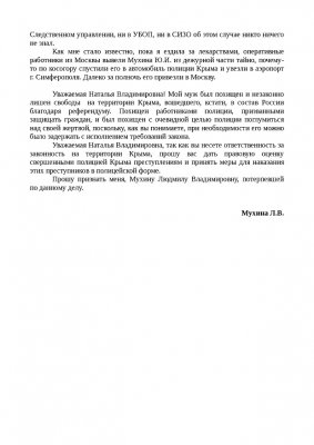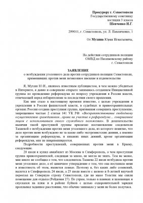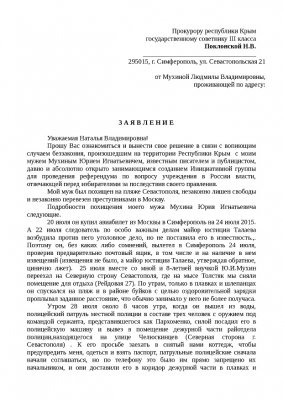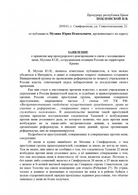 ОВД-Инфо публикует заявления одного из обвиняемых по «Делу „Армии воли народа“» публициста Юрия Мухина и его жены Людмилы Мухиной, адресованные прокурору Крыма Наталье Поклонской и прокурору Севастополя Игорю Шевченко.