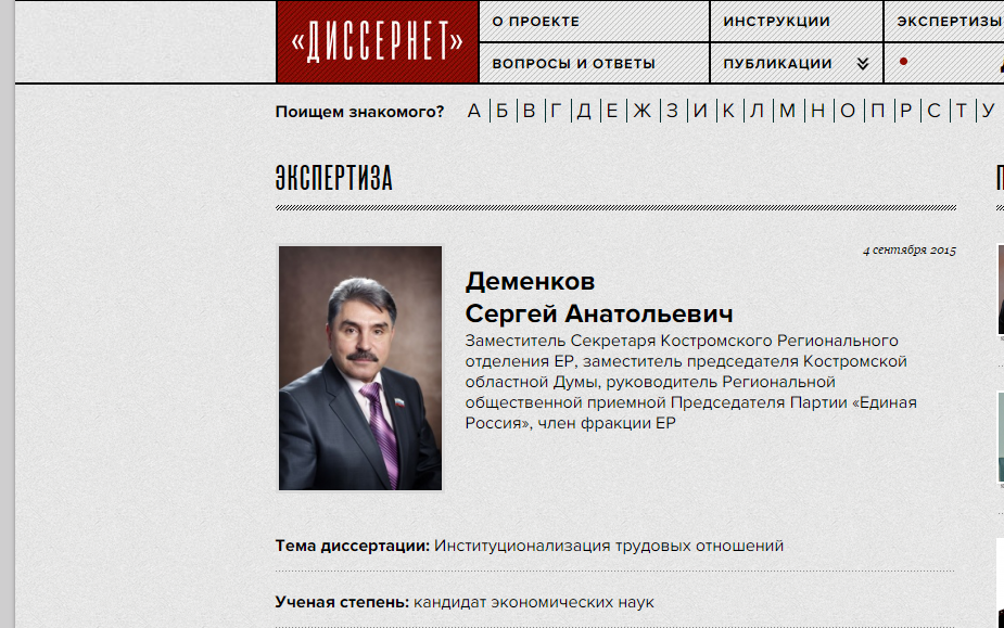 По данным исследователя, представителя вольного общества «Диссернет» Андрея Заякина, высокопоставленный представитель костромского регионального парламента Сергей Деменков, входящий во фракцию «Единая Россия», 21 октября 2005 года защитил кандидатскую диссертацию по экономике на тему: «Институционализация трудовых отношений». Научным руководителем у Деменкова выступил экономист Николай Гибало, оппонентами - Владимир Пефтиев и Александр Олейников. Работа выполнена в Костромском государственном университете имени Н.А.Некрасова, ведущей организацией была Костромская государственная сельскохозяйственная академия.