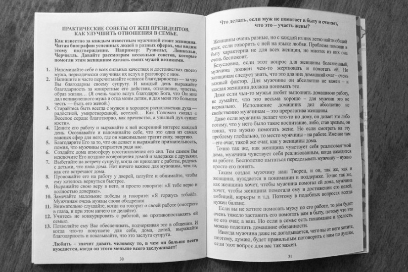 • В московских женских консультациях дают «Полезные советы по укреплению семейных отношений»: в тексте брошюрки автор отмечает, что «мужчина всегда больше женщины желает интимных отношений», «женщине лучше не будить в мужчине »зверя»», «больше всего он любит, чтобы женщина шла за ним, а не впереди него». Автор пособия заявила, что «советы основаны на нормальных христианских принципах» и «многие акушеры-гинекологи, умудренные жизненным опытом, эти советы поддержали».
