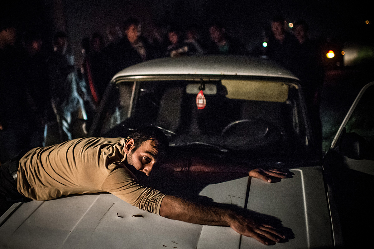 Мужчина лежит на капоте автомобиля. Во время одного из рейдов был замечен автомобиль, подходящий под описание из ориентировки. При попытке проверить документы водитель и пассажиры оказали активное сопротивление.Фото: Рамиль Ситдиков/фотоконкурс "Прямой Взгляд" Номинация «Компромисс»